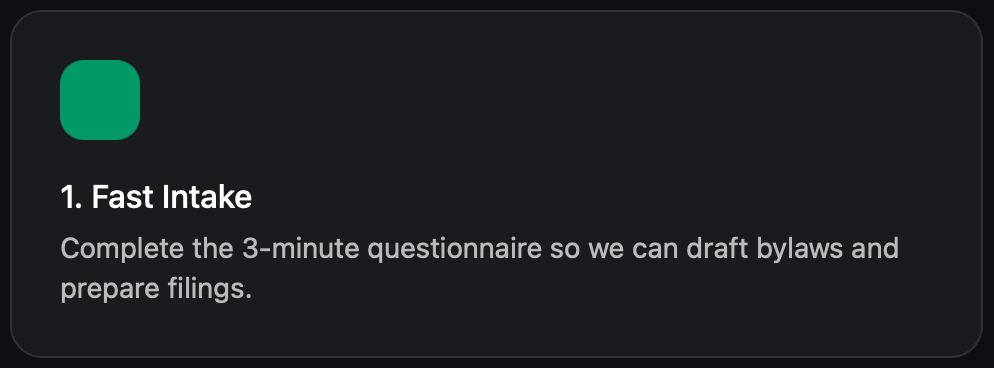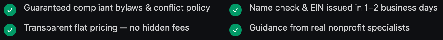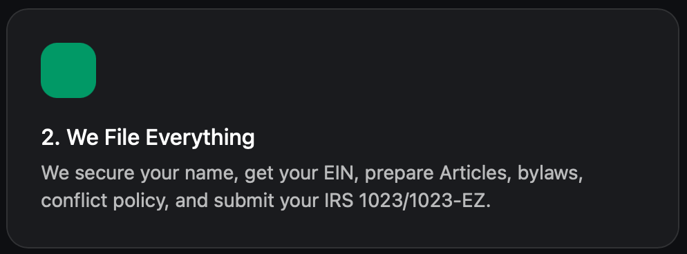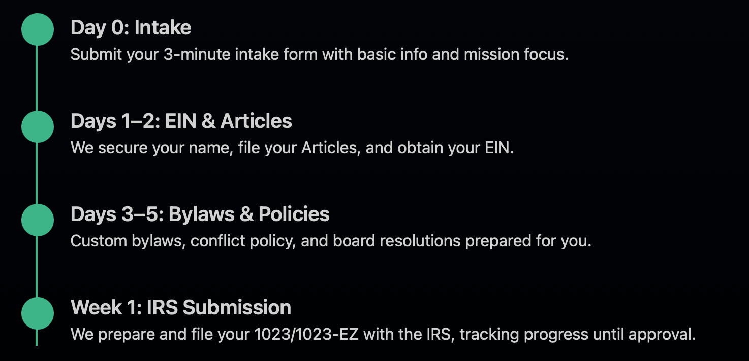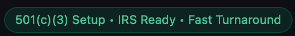 We handle formation, bylaws, EIN, state filings, and the IRS 1023/1023-EZ so you can focus on your mission. Most clients finish the intake in under 3 minutes.